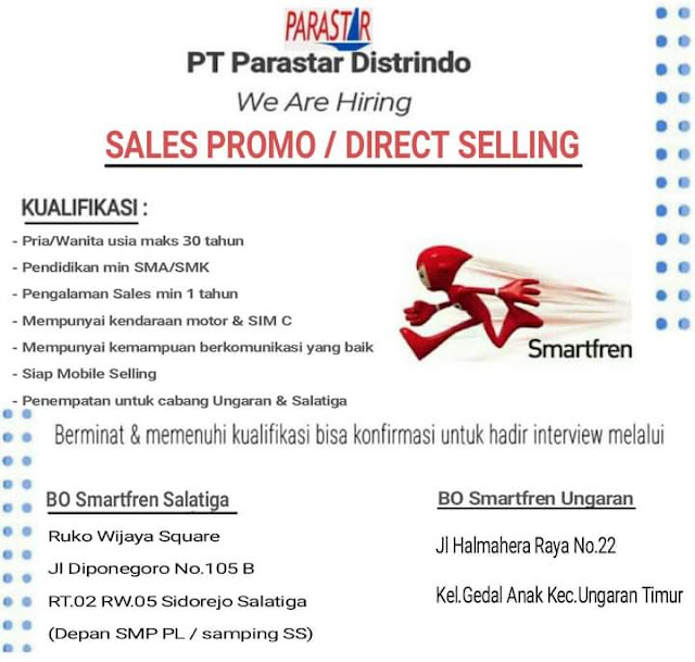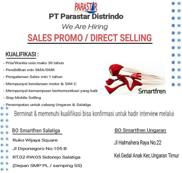PT. PARASTAR DISTRINDO adalah salah satu distributor telekomunikasi terkemuka dengan produk unggulan dan berbagai operator telepon di Indonesia, saat ini kami membuka lowongan kerja untuk posisi :