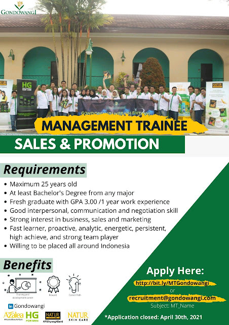 Lowongan Kerja Management Trainee Sales & Promotion PT Gondowangi Tradisional Kosmetika April 2021