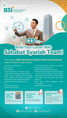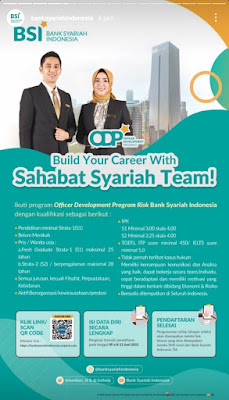 Bulan ini, Bank Syariah Indonesia (BSI) membuka lowongan pekerjaan posisi Officer Development Program (ODP). Jika kamu sesuai dengan kualifikasi, diharapkan segera melamar sebelum lowongan ditutup. Informasi lowongan kerja yang kami sampaikan di bawah bersumber dari : Instagram story Official @banksyariahindonesia. Jadi kami pastikan lowongan kerja ini resmi dan pastinya GRATIS, tanpa ada pungutan biaya selama proses seleksi.