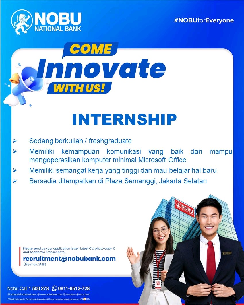 Haloo, bulan ini PT Bank Nationalnobu Tbk (NobuBank) membuka peluang berkarir bagi kamu Mahasiswa / Lulusan baru yang ingin merasakan kerja di salah satu Bank Swasta terbesar di Indonesia